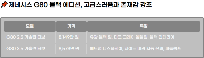 ์ ๋ค์์ค G80 ๋ธ๋ ์๋์ ์ด 2025๋ ์ถ์๋์์ผ๋ฉฐ, ๋ ํนํ ๋ธ๋ ์์๊ณผ ๊ณ ๊ธ์ค๋ฌ์ด ๋์์ธ์ ๊ฐ์กฐํ ๋ชจ๋ธ์ ๋๋ค. 20์ธ์น ์ ๊ด ๋ธ๋ ํ ๊ณผ ๋คํฌ ๊ทธ๋ ์ด ์ ๋ธ๋ผ, ๋ธ๋ ์ปฌ๋ฌ๋ก ํต์ผ๋ ์ธํ ๋ฆฌ์ด ๋ฑ ์ฐจ๋ณํ๋ ์์๊ฐ ์ ์ฉ๋์์ต๋๋ค. ๊ฐ๊ฒฉ์ 2.5 ๊ฐ์๋ฆฐ ํฐ๋ณด ๋ชจ๋ธ์ด 8,149๋ง ์, 3.5 ๊ฐ์๋ฆฐ ํฐ๋ณด ๋ชจ๋ธ์ด 8,573๋ง ์์ ๋๋ค.