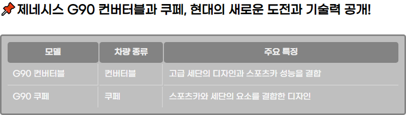์ ๋ค์์ค G90 ๊ธฐ๋ฐ์ ์ปจ๋ฒํฐ๋ธ๊ณผ ์ฟ ํ ๋ชจ๋ธ์ ํ๋์๋์ฐจ๊ฐ ๊ณ ๊ธ์ฐจ ์์ฅ์์ ์๋ก์ด ๋์ ์ ์์ํ๋ ์ค์ํ ์ฌ๋ก์ ๋๋ค. ์ ๋ค์์ค๋ ๊ทธ๋์ ๊ณ ๊ธ ์ธ๋จ๊ณผ SUV์ ์ง์คํด์์ง๋ง, ์ด๋ฒ์๋ ์คํฌ์ธ ์นด์ ์ปจ๋ฒํฐ๋ธ ๋ชจ๋ธ์ ํตํด ์๋ก์ด ๊ธธ์ ๋ชจ์ํ๊ณ ์์ต๋๋ค. ์ด๋ฌํ ๋ชจ๋ธ๋ค์ ์ ๋ค์์ค์ ๋ธ๋๋ ์ด๋ฏธ์ง๋ฅผ ๋์ฑ ๊ฐํํ๋ฉฐ, ์๋์ฐจ ์ฐ์ ์์์ ํ์ ์ ์ธ ๋์ ์ ๋ณด์ฌ์ฃผ๋ ์๋ก ๊ผฝํ๊ณ ์์ต๋๋ค.