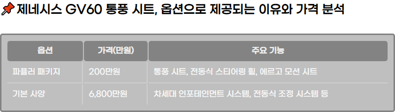 GV60์์ ์ ํํ ์ ์๋ ์ฃผ์ ์ต์ ์๋ ํํฐ๋ฌ ํจํค์ง๊ฐ ์์ต๋๋ค. ์ด ํจํค์ง๋ ํตํ ์ํธ, ์ ๋์ ์คํฐ์ด๋ง ํ , ์๋ฅด๊ณ ๋ชจ์ ์ํธ ๋ฑ์ ๊ธฐ๋ฅ์ ํฌํจํ๊ณ ์์ผ๋ฉฐ, ์ด ๊ฐ๊ฒฉ์ ์ฝ 200๋ง์ ์ด์์ ๋๋ค. ์ด๋ฌํ ํจํค์ง ์ ํ์ ์ฐจ๋ ๊ฐ๊ฒฉ์ ์๋นํ ์ฆ๊ฐ์ํฌ ์ ์์ง๋ง, ๋ง์ ์๋น์๋ค์ด ๊ธฐ๋ณธ ์ฌ์ ์ด์์ ํธ์์ฑ์ ์ํ๊ธฐ ๋๋ฌธ์ ์ ํํ๋ ๊ฒฝํฅ์ด ์์ต๋๋ค.