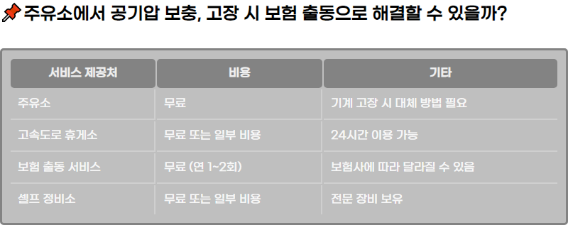 ๊ณ ์๋๋ก ํด๊ฒ์์์๋ ๋๊ฐ 24์๊ฐ ์ด์๋๋ ์ฃผ์ ์๋ฅผ ์ฐพ์ ์ ์์ต๋๋ค. ์ด ์ฃผ์ ์๋ค์ ์์ฃผ ํ์ด์ด ๊ณต๊ธฐ์์ ๋ณด์ถฉํ ์ ์๋ ๊ธฐ๊ณ๋ฅผ ๊ตฌ๋นํด ๋๊ณ ์์ผ๋ฉฐ, ์ผ๋ถ ๊ณ ์๋๋ก ํด๊ฒ์๋ ๋ฌด๋ฃ๋ก ๊ณต๊ธฐ์์ ๋ณด์ถฉํด์ค๋๋ค. ๊ณ ์๋๋ก๋ฅผ ์ด์ ํ ๋ ๊ณต๊ธฐ์์ ์ฒดํฌํ๊ณ , ๋ฌธ์ ๊ฐ ์๊ธฐ๋ฉด ๊ฐ๊น์ด ์ฃผ์ ์์์ ๊ณต๊ธฐ์์ ๋ณด์ถฉํ๋ ๊ฒ์ด ์ข์ต๋๋ค.