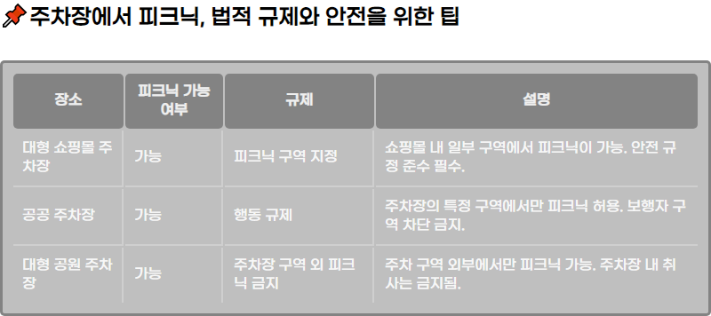 μ£Όμ°¨μ₯μμ νΌν¬λμ΄ κ°λ₯ν λͺ κ°μ§ μμλ₯Ό λ€μ΄λ³΄κ² μ΅λλ€. λν μΌνλͺ° μ£Όμ°¨μ₯μ΄λ 곡곡μμ€μ μ£Όμ°¨μ₯μμλ λ³λμ νΌν¬λ ꡬμμ μ 곡νλ κ²½μ°κ° λ§μ΅λλ€. μλ₯Ό λ€μ΄, μμΈμ ν λν μΌνλͺ° μ£Όμ°¨μ₯μμλ νΉλ³ν νΌν¬λμ ν μ μλ ꡬμμ λ§λ ¨ν΄λκ³ , μΌμ μκ° λμ νΌν¬λμ μ¦κΈΈ μ μλλ‘ κ·μ ν κ²½μ°κ° μμ΅λλ€. μ΄ κ²½μ°, λ°©λ¬Έκ°λ€μ μμ νκ² νΌν¬λμ μ¦κΈΈ μ μμΌλ©°, μ£Όμ°¨μ₯ λ΄ λ€λ₯Έ μμ€λ ν¨κ» μ΄μ©ν μ μμ΅λλ€.