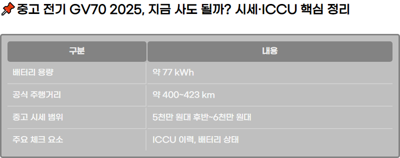 2025๋…„ ๊ธฐ์ค€ ์ค‘๊ณ  ์ „๊ธฐ GV70 ๊ตฌ๋งค๋ฅผ ๊ณ ๋ฏผํ•˜๋Š” ์†Œ๋น„์ž๋ฅผ ์œ„ํ•ด ์‹œ์„ธ ํ๋ฆ„, ICCU ์ด์Šˆ, ๋ฐฐํ„ฐ๋ฆฌ ์„ฑ๋Šฅ, ์œ ์ง€ ๋น„์šฉ, ๋ฆฌ์ฝœ ํ™•์ธ ๋ฐฉ๋ฒ•๊นŒ์ง€ ๊ฐ๊ด€์  ์ž๋ฃŒ ๊ธฐ๋ฐ˜์œผ๋กœ ์ •๋ฆฌํ–ˆ์Šต๋‹ˆ๋‹ค. ์ „๊ธฐ SUV ์ค‘๊ณ ์ฐจ ๊ตฌ๋งค ์ „ ๋ฐ˜๋“œ์‹œ ํ™•์ธํ•ด์•ผ ํ•  ํ•ต์‹ฌ ์ •๋ณด๋ฅผ ์ œ๊ณตํ•ฉ๋‹ˆ๋‹ค.