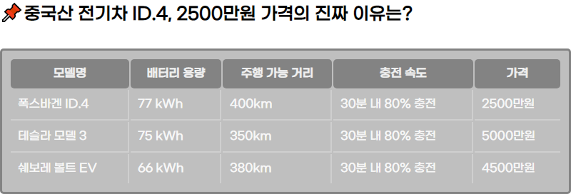 | ํญ์ค๋ฐ๊ฒ ID.4 | 77 kWh | 400km | 30๋ถ ๋ด 80% ์ถฉ์ | 2500๋ง์ |