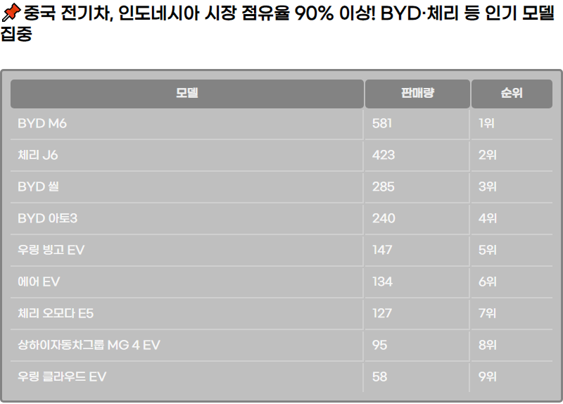์ค‘๊ตญ ์ „๊ธฐ์ฐจ, ์ธ๋„๋„ค์‹œ์•„ ์‹œ์žฅ ์ ์œ ์œจ 90% ์ด์ƒ! BYD·์ฒด๋ฆฌ ๋“ฑ ์ธ๊ธฐ ๋ชจ๋ธ ์ง‘์ค‘