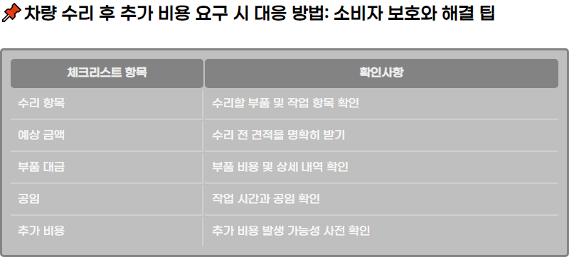 ์๋์ฐจ ์๋ฆฌ ํ ์ถ๊ฐ ๋น์ฉ์ด ๋ฐ์ํ์ ๋, ๋ฒ์ ๋์๊ณผ ์๋น์ ๋ณดํธ ๊ธฐ๊ด ์ ๊ณ ๋ฐฉ๋ฒ์ ํ์ธํ์ธ์. ์ ์ ํ ๋์์ผ๋ก ๋ฌธ์ ๋ฅผ ํด๊ฒฐํ๋ ๋ฐฉ๋ฒ์ ์๋ ค๋๋ฆฝ๋๋ค.