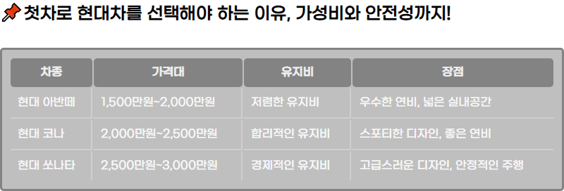 ์ฒซ์ฐจ ๊ตฌ๋งค๋ฅผ ๊ณ ๋ คํ ๋ ๊ฐ์ฅ ์ค์ํ ์์๋ ๊ฒฝ์ ์ฑ์ ๋๋ค. ์ฒซ์ฐจ๋ ๋ง์ ์ฌ๋๋ค์ด ์ฒ์์ผ๋ก ์ฅ๊ธฐ์ ์ธ ์ฐจ๋ ์ ์ง ๋น์ฉ๊ณผ ์์ ์ฑ ๋ฑ์ ๊ณ ๋ คํ๋ ์ค์ํ ์ ํ์ด๊ธฐ ๋๋ฌธ์, ๊ฐ์ฑ๋น๊ฐ ์ฐ์ ์ ๋ฉ๋๋ค. ํ๋์ฐจ๋ ๊ฐ๊ฒฉ๊ณผ ์ฑ๋ฅ ๋ฉด์์ ๋ฐ์ด๋ ๊ท ํ์ ์ ๊ณตํฉ๋๋ค.