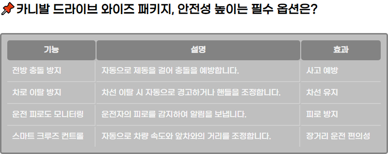 ์นด๋๋ฐ ๋๋ผ์ด๋ธ ์์ด์ฆ ํจํค์ง๋ ์ ๋ฐฉ ์ถฉ๋ ๋ฐฉ์ง, ์ฐจ๋ก ์ดํ ๋ฐฉ์ง ๋ฑ ๋ค์ํ ์์ ๊ธฐ๋ฅ์ ์ ๊ณตํฉ๋๋ค. ์ด ํจํค์ง๋ฅผ ์ ํํ๋ฉด ์ฌ๊ณ ๋ฅผ ์๋ฐฉํ๊ณ ๋ณดํ ํ ์ธ ํํ์ ๋ฐ์ ์ ์์ต๋๋ค. ๊ทธ๋๋นํฐ ํธ๋ฆผ์ ์ต์ ํ๋ ์ต์ ์ผ๋ก, ์์ ์ฑ์ ๋์ด๊ธฐ ์ํ ํ์ ์ ํ ์ฌํญ์ ๋๋ค.