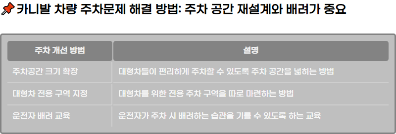 ์นด๋๋ฐ ์ฐจ๋์ ์ฃผ์ฐจ ๋ฌธ์ ๋ ๋จ์ํ ์ฐจ๋ ํฌ๊ธฐ๋ง์ ๋ฌธ์ ๊ฐ ์๋๋ผ, ์ฃผ์ฐจ ํ๊ฒฝ๊ณผ ์ด์ ์์ ์ฃผ์๋ ์ค์ํ ์์์ ๋๋ค. ์ฃผ์ฐจ ๊ณต๊ฐ์ ๊ฐ์ ํ๊ณ , ์ด์ ์์ ๋ฐฐ๋ ค๋ฅผ ๋์ฌ๊ฐ๋ ๊ฒ๋ง์ผ๋ก๋ ๋ง์ ์ฃผ์ฐจ ๋ฌธ์ ๋ฅผ ํด๊ฒฐํ ์ ์์ต๋๋ค. ๋ํ, ๋ํ์ฐจ ์ ์ฉ ์ฃผ์ฐจ ๊ตฌ์ญ์ ๋ง๋ จํ๋ ๋ฑ์ ์ถ๊ฐ์ ์ธ ์กฐ์น๊ฐ ํ์ํฉ๋๋ค.