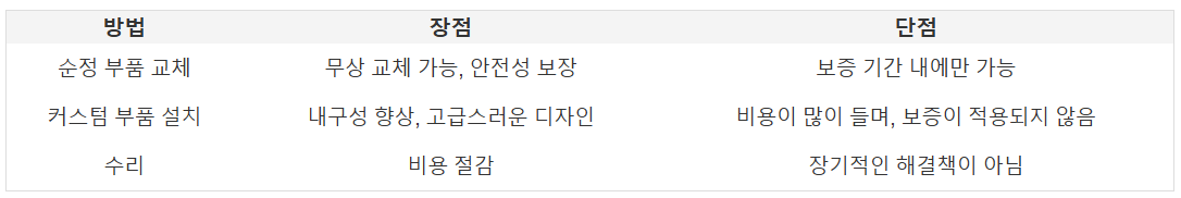 | 컀μ€ν λΆν μ€μΉ | λ΄κ΅¬μ± ν₯μ, κ³ κΈμ€λ¬μ΄ λμμΈ | λΉμ©μ΄ λ§μ΄ λ€λ©°, 보μ¦μ΄ μ μ©λμ§ μμ |