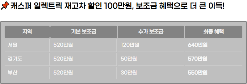 ์ง์ญ์ ๋ฐ๋ผ ๋ณด์กฐ๊ธ ํํ์ด ๋ค๋ฅด๊ธฐ ๋๋ฌธ์, ์บ์คํผ ์ผ๋ ํธ๋ฆญ์ ๊ตฌ๋งคํ๊ธฐ ์ ์๋ ๋ณธ์ธ์ ์ง์ญ์์ ์ ๊ณต๋๋ ๋ณด์กฐ๊ธ์ ํ์ธํ๋ ๊ฒ์ด ๋งค์ฐ ์ค์ํฉ๋๋ค. ์๋ฅผ ๋ค์ด, ์์ธ์๋ 120๋ง ์์ ๋ณด์กฐ๊ธ์ ์ ๊ณตํ์ง๋ง, ๋ค๋ฅธ ์ง์ญ์ ๋ณด์กฐ๊ธ ๊ธ์ก์ด ๋ค๋ฅผ ์ ์์ต๋๋ค. ๋ํ, ๋ณด์กฐ๊ธ์ ์ ์ฉ๋ฐ๊ธฐ ์ํ ์กฐ๊ฑด๋ ์ง์ญ๋ง๋ค ๋ค๋ฅผ ์ ์๊ธฐ ๋๋ฌธ์, ๊ฐ ์ง์ญ์ ๊ณต์ ๋ณด์กฐ๊ธ ์๋ด๋ฅผ ๋ฐ๋์ ํ์ธํด์ผ ํฉ๋๋ค.
