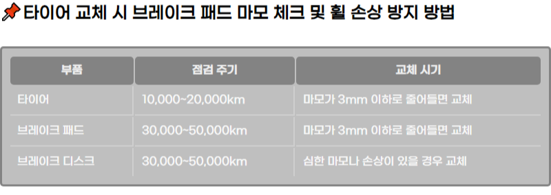 | ํ์ด์ด | 10,000~20,000km | ๋ง๋ชจ๊ฐ 3mm ์ดํ๋ก ์ค์ด๋ค๋ฉด ๊ต์ฒด |