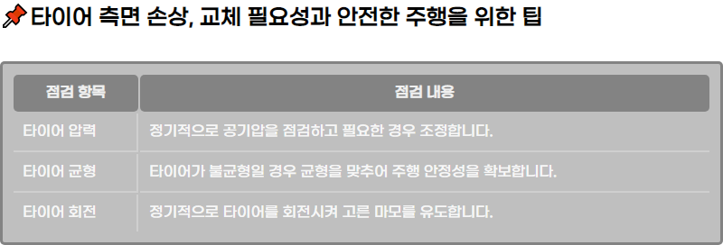 ํ์ด์ด ์ธก๋ฉด์ ์์์ ์ข ์ข ๊ตฌ๋ฉ์ด๋ ์ฐข์ด์ง ๋ถ๋ถ์ผ๋ก ๋ํ๋ ์ ์์ผ๋ฉฐ, ์ด๋ฐ ์์์ ํ์ด์ด์ ๋ด๋ถ ๊ตฌ์กฐ๋ฅผ ๋์ฑ ์ ํ์ํฌ ์ ์์ต๋๋ค. ํนํ ์ถฉ๊ฒฉ์ด๋ ๊ณผ์ด๋ก ์ธํด ์์์ด ๋์ฑ ์ฌํ๋ ์ ์๊ธฐ ๋๋ฌธ์, ์ด๋ฌํ ์ํ๋ก ์ฃผํ์ ๊ณ์ํ๋ ๊ฒ์ ๋งค์ฐ ์ํํฉ๋๋ค.