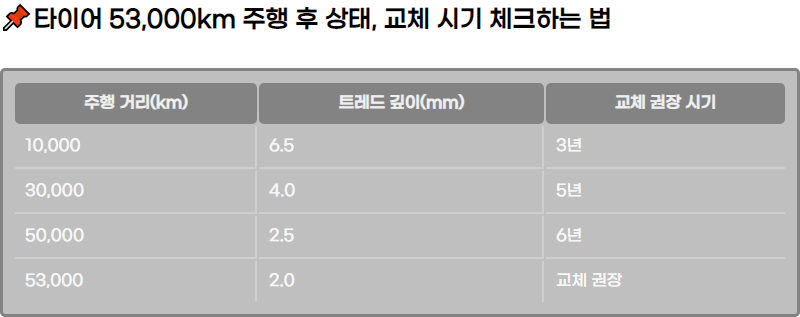 νμ΄μ΄λ μ°¨λμ μ€μν λΆνμΌλ‘, μ°¨λμ μμ μ μ§μ μ μΈ μν₯μ λ―ΈμΉ©λλ€. 53,000kmλ₯Ό μ£Όνν ν νμ΄μ΄μ μνλ₯Ό μ κ²νλ κ²μ μ€μν μμ μ λλ€. μ£Όν κ±°λ¦¬κ° λ§μμ§λ©΄ νμ΄μ΄μ λ§λͺ¨ μνκ° μ μ°¨ λμ λκ² λ³ννκ³ , μ΄λ νμ΄μ΄μ μ±λ₯ μ νλ‘ μ΄μ΄μ§ μ μκΈ° λλ¬Έμ λλ€. λ°λΌμ μ μ ν μμ μ κ΅μ²΄νλ κ²μ΄ μ€μν©λλ€.