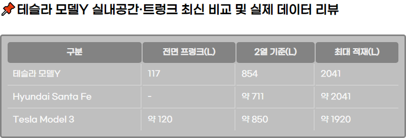 ํ ์ฌ๋ผ ๋ชจ๋ธY 2026 ์ต์ ์ค๋ด ๊ณต๊ฐ๊ณผ ํธ๋ ํฌ ์ฉ๋์ ๊ฐ๊ด์ ์์น๋ก ๋ถ์ํ ๊ธ์ ๋๋ค. 2์ด ๋จธ๋ฆฌ/๋ค๋ฆฌ ๊ณต๊ฐ, ํธ๋ ํฌ ์ ์ฌ๋, ๊ฒฝ์ SUV์ ๋น๊ตํ๋ฅผ ํฌํจํ ๋ฐ์ดํฐ ์ค์ฌ ๋ฆฌ๋ทฐ์ ๋๋ค.