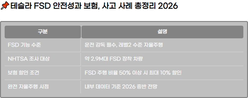 2026๋…„ ๊ธฐ์ค€ ํ…Œ์Šฌ๋ผ FSD(Full Selfโ€‘Driving) ์ž์œจ์ฃผํ–‰ ๊ธฐ์ˆ ์˜ ์•ˆ์ „์„ฑ, ์‚ฌ๊ณ  ํ†ต๊ณ„, ๋ฒ•์  ์ฑ…์ž„๊ณผ ๋ณดํ—˜ ํ˜œํƒ ์ •๋ณด๋ฅผ ์ •๋ฆฌํ–ˆ์Šต๋‹ˆ๋‹ค. ์ตœ์‹  ๋ฏธ๊ตญ NHTSA ์กฐ์‚ฌ ๋‚ด์šฉ, ๊ตญ๋‚ด ๋„์ž… ํ˜„ํ™ฉ, FSD ๋ณดํ—˜ ํ• ์ธ ์ •์ฑ…๊ณผ ๊ธฐ์ˆ ์  ํ•œ๊ณ„๊นŒ์ง€ ํ•ต์‹ฌ ๋‚ด์šฉ๋งŒ ์•Œ๊ธฐ ์‰ฝ๊ฒŒ ์„ค๋ช…ํ•ฉ๋‹ˆ๋‹ค.