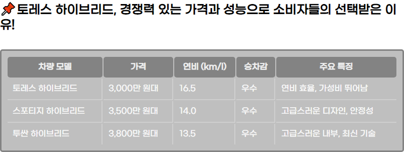 | ํ ๋ ์ค ํ์ด๋ธ๋ฆฌ๋ | 3,000๋ง ์๋ | 16.5 | ์ฐ์ | ์ฐ๋น ํจ์จ, ๊ฐ์ฑ๋น ๋ฐ์ด๋จ |