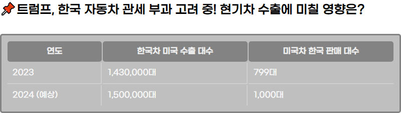 ๋๋๋ ํธ๋ผํ ๋ฏธ๊ตญ ๋ํต๋ น์ด ํ๊ตญ ์๋์ฐจ์ ๋ํ ๊ด์ธ ๋ถ๊ณผ๋ฅผ ๊ณ ๋ ค ์ค์ด๋ผ๊ณ ๋ฐํ์ต๋๋ค. ์ด์ ๋ํ ์ฐ๋ ค๊ฐ ์ปค์ง๋ ๊ฐ์ด๋ฐ, ํ๊ตญ ์๋์ฐจ ์ฐ์ ์ ๋ฏธ๊ตญ ๋ด ์์ฐ ํ๋์ ์์ถ์ง ๋ค๋ณํ ๋ฑ์ ๋์ ๋ฐฉ์์ ๊ฒํ ํ๊ณ ์์ต๋๋ค. 2024๋ ํ๊ตญ์ ์ฐจ๋ ์์ถ๊ณผ ๋ฏธ๊ตญ์ ์ฐจ๋ ํ๋งค ์ค์ ์ ๊ธ๋ก๋ฒ ์์ฅ์์์ ๊ฒฝ์๋ ฅ์ ๊ฐ๋ ํ ์ค์ํ ์งํ๊ฐ ๋ ๊ฒ์ ๋๋ค.