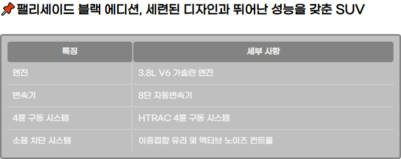 νŒ°λ¦¬μ„Έμ΄λ“œ λΈ”λž™ μ—λ””μ…˜μ€ 3.8L V6 가솔린 μ—”μ§„κ³Ό 8단 μžλ™λ³€μ†κΈ°λ₯Ό μ‘°ν•©ν•˜μ—¬ κ°•λ ₯ν•œ μ„±λŠ₯을 μ œκ³΅ν•©λ‹ˆλ‹€. 이 μ°¨λŸ‰μ€ 높은 좜λ ₯κ³Ό ν•¨κ»˜ λΆ€λ“œλŸ½κ³  μ•ˆμ •μ μΈ 주행을 κ°€λŠ₯ν•˜κ²Œ ν•˜μ—¬, 도심과 κ³ μ†λ„λ‘œμ—μ„œ λͺ¨λ‘ λ›°μ–΄λ‚œ μ„±λŠ₯을 λ°œνœ˜ν•©λ‹ˆλ‹€. 특히, HTRAC 4λ₯œ ꡬ동 μ‹œμŠ€ν…œμ„ 톡해 λ‹€μ–‘ν•œ μ£Όν–‰ ν™˜κ²½μ—μ„œλ„ μ•ˆμ •μ μ΄κ³  효율적인 주행을 보μž₯ν•©λ‹ˆλ‹€.