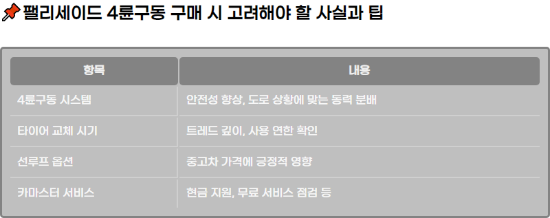 ํฐ๋ฆฌ์ธ์ด๋ 4๋ฅ๊ตฌ๋ ์์คํ ๊ณผ ๊ด๋ จ๋ ์ต์ ์ ๋ณด์ ํ์ด์ด ๋ง๋ชจ, ์ ๋ฃจํ ์ต์ , ์นด๋ง์คํฐ ์๋น์ค ๋ฑ ์ค๊ณ ์ฐจ ๊ตฌ๋งค ์ ์ฐธ๊ณ ํ ์ค์ํ ์ฌํญ๋ค์ ๋ค๋ฃน๋๋ค. ์ฐจ๋ ์ ํ ์ ํ์์ ์ผ๋ก ํ์ธํด์ผ ํ ์์๋ค์ ๋ํด ์์ธํ ์์๋ณด์ธ์. 4๋ฅ๊ตฌ๋์ ๋ํ ์ดํด๋ฅผ ๋๊ณ , ์ค๊ณ ์ฐจ ๊ฑฐ๋ ์ ์ ์ฉํ ํ์ ์ ๊ณตํฉ๋๋ค.