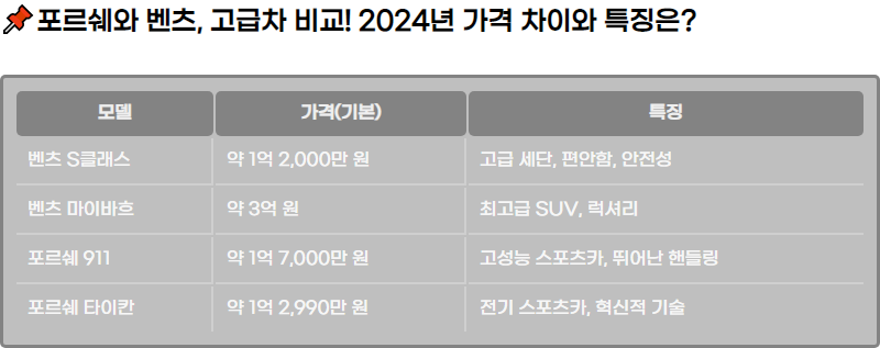 ๋ฒค์ธ ์ ํฌ๋ฅด์๋ ๊ฐ๊ธฐ ๋ค๋ฅธ ๊ณ ๊ธ์ฐจ ๋ธ๋๋๋ก, 2024๋ ๋ชจ๋ธ์ ๊ฐ๊ฒฉ ์ฐจ์ด์ ํน์ง์ ๋ํ ์์ธํ ๋น๊ต๋ฅผ ์ ๊ณตํฉ๋๋ค. ๋ฒค์ธ ๋ ๋ค์ํ ์ธ๊ทธ๋จผํธ๋ฅผ, ํฌ๋ฅด์๋ ๊ณ ์ฑ๋ฅ ์คํฌ์ธ ์นด์ SUV๋ฅผ ์ค์ฌ์ผ๋ก ๋ผ์ธ์ ์ ๊ตฌ์ฑํ๊ณ ์์ต๋๋ค. ๋ฒค์ธ ์ ๋ง์ด๋ฐํ์ ํฌ๋ฅด์์ 911์ ๋น๊ตํ๋ฉฐ, ๊ณ ๊ธ์ฐจ ์์ฅ์์ ์ด๋ค ๋ธ๋๋์ ๊ฒฝ์๋ ฅ์ ์ดํด๋ด ๋๋ค.