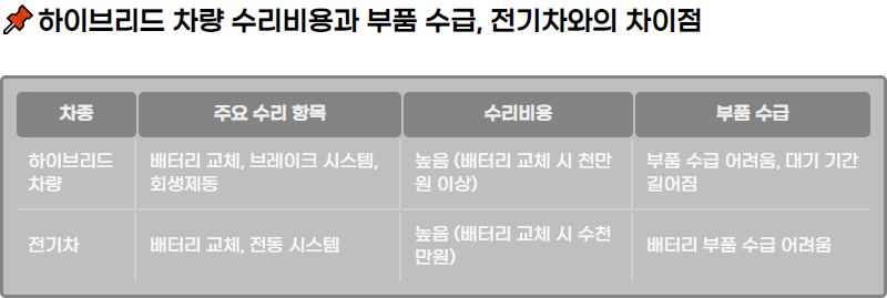 ํ์ด๋ธ๋ฆฌ๋ ์ฐจ๋์ ์๋ฆฌ๋น์ฉ๊ณผ ๋ถํ ์๊ธ ๋ฌธ์ ๋ ๋ด์ฐ๊ธฐ๊ด ์ฐจ๋๊ณผ ๋น๊ตํ์ฌ ๋ ๋์ ๋น์ฉ์ ์ ๋ฐํ ์ ์์ต๋๋ค. ํนํ ํ์์ ๋ ์์คํ , ๋ธ๋ ์ดํฌ ๋ถํ, ๋ฐฐํฐ๋ฆฌ ๊ต์ฒด ๋ฑ์ ํฐ ๋น์ฉ์ด ๋ฐ์ํ ์ ์์ผ๋ฉฐ, ์ ๊ธฐ์ฐจ์์ ์ฐจ์ด์ ๋ ๊ณ ๋ คํด์ผ ํฉ๋๋ค. ๋ํ ํ์ด๋ธ๋ฆฌ๋ ์ฐจ๋์ ๋ถํ ์๊ธ์ ์ด๋ ค์์ด ์์ ์ ์์ด, ์ฐจํ ์๋ฆฌ ์ ์์์น ๋ชปํ ๋๊ธฐ ๊ธฐ๊ฐ์ด ๊ธธ์ด์ง ์ ์์ต๋๋ค.