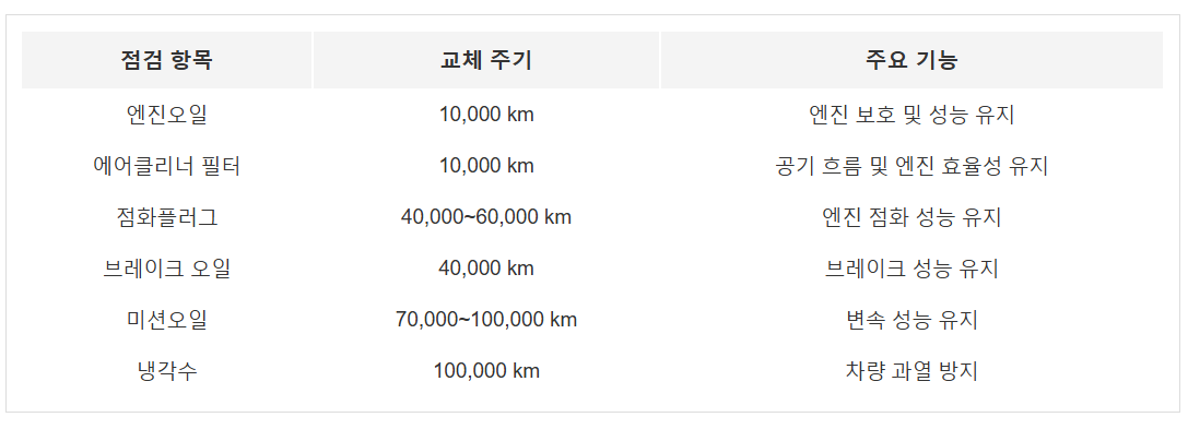 | ์์ง์ค์ผ | 10,000 km | ์์ง ๋ณดํธ ๋ฐ ์ฑ๋ฅ ์ ์ง |