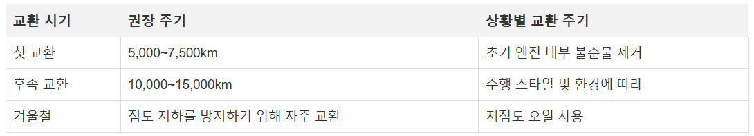 | ํ์ ๊ตํ | 10,000~15,000km | ์ฃผํ ์คํ์ผ ๋ฐ ํ๊ฒฝ์ ๋ฐ๋ผ |