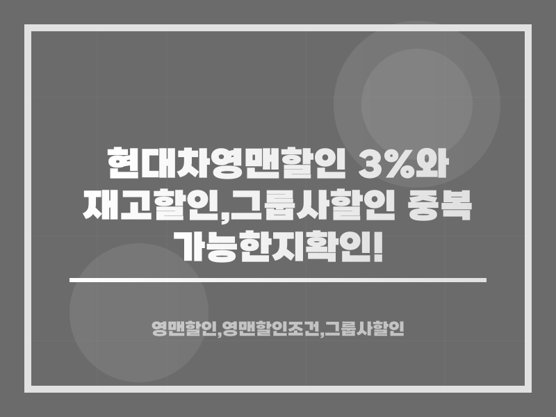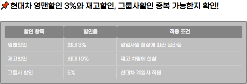 ์๋์ฐจ๋ฅผ ๊ตฌ๋งคํ ๋ ํ ์ธ ํํ์ ๋ฐ๋ ๊ฒ์ ์๋น์์๊ฒ ๋งค์ฐ ์ค์ํ ์์์ ๋๋ค. ํนํ ํ๋์ฐจ์ ๊ฐ์ ๋๊ธฐ์ ์์ ์ ๊ณตํ๋ ํ ์ธ ํํ์ ์๋น์๋ค์ด ์ฐจ๋์ ๊ตฌ๋งคํ๋ ๋ฐ ํฐ ์ํฅ์ ๋ฏธ์นฉ๋๋ค. ํ๋์ฐจ์์ ์ ๊ณตํ๋ ์๋งจํ ์ธ 3%์ ์ฌ๊ณ ํ ์ธ์ ๋ ๊ฐ์ง ์ฃผ์ ํ ์ธ ํญ๋ชฉ์ผ๋ก, ๋ง์ ๊ตฌ๋งค์๋ค์ด ์ด ๋์ ๋น๊ตํ๊ณ ๊ณ ๋ฏผํ๊ฒ ๋ฉ๋๋ค. ๊ทธ๋ ๋ค๋ฉด ์ด ๋ ๊ฐ์ง ํ ์ธ์ ์ด๋ป๊ฒ ๋ค๋ฅผ๊น์?