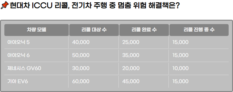 2024๋ ํ๋์ฐจ๋ ICCU ๊ฒฐํจ์ผ๋ก ์ธํด ์ ์ธ๊ณ์ ์ผ๋ก ๋๊ท๋ชจ ๋ฆฌ์ฝ์ ์งํํ๊ณ ์์ต๋๋ค. ๋ฆฌ์ฝ ๋์ ์ฐจ๋์๋ ์์ด์ค๋5, ์์ด์ค๋6, ์ ๋ค์์ค GV60 ๋ฑ ํ๋์ฐจ์ ๊ธฐ์์ ์ ๊ธฐ์ฐจ ๋ชจ๋ธ๋ค์ด ํฌํจ๋ฉ๋๋ค. ๋ฆฌ์ฝ ์งํ ๋ฐฉ์์ ์ฃผ๋ก ์ํํธ์จ์ด ์ ๋ฐ์ดํธ์ ๋ถํ ๊ต์ฒด๋ก ์ด๋ฃจ์ด์ง๋๋ค.