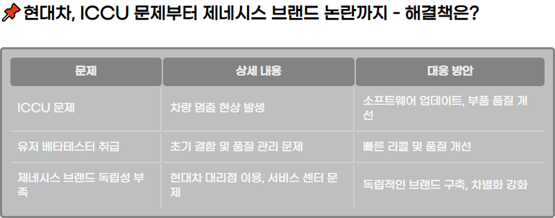 ํ๋์ฐจ๋ ICCU ๋ฌธ์ , ์ด๊ธฐ ๊ฒฐํจ, ์ ๋ค์์ค ๋ธ๋๋์ ๋ ๋ฆฝ์ฑ ๋ถ์กฑ ๋ฌธ์ ๋ฅผ ํด๊ฒฐํ๊ธฐ ์ํด ์ฌ๋ฌ ๊ฐ์ง ๋์ ๋ฐฉ์์ ๋ง๋ จํด์ผ ํฉ๋๋ค. ์๋น์๋ค์ ๋ถ๋ง์ ํด๊ฒฐํ๊ณ ์ ๋ขฐ๋ฅผ ํ๋ณตํ๊ธฐ ์ํด์๋ ๊ณ ๊ฐ ์๋น์ค ํฅ์๊ณผ ํ์ง ๊ด๋ฆฌ ๊ฐํ๊ฐ ํ์์ ์ ๋๋ค.
