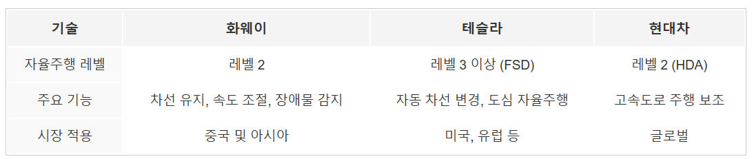 νμ¨μ΄μ μμ¨μ£Όν κΈ°μ μ μ΄κΈ° λ¨κ³μμλ λμ μ μΈ κ³Όμ λ₯Ό μκ³ μμμ§λ§, νμ¬λ λΉ λ₯΄κ² λ°μ νκ³ μμ΅λλ€. νμ¨μ΄λ μμ¨μ£Όν κΈ°μ μ μ°κ΅¬κ°λ°νλ©΄μ μλ‘μ΄ κ³ μλλ‘ λ΄λΉκ²μ΄μ μμ€ν μ ν΅ν©νλ λ±μ νμ μ 보μ¬μ£Όμμ΅λλ€. κ·ΈλΌμλ λΆκ΅¬νκ³ , ν μ¬λΌμ νλμ°¨λ μμ¨μ£Όν κΈ°μ λΆμΌμμ μ΄λ―Έ μλΉν μμ₯ μ μ μ¨μ μ°¨μ§νκ³ μκΈ° λλ¬Έμ, νμ¨μ΄κ° μ΄λ₯Ό μΆμνλ €λ©΄ κΈ°μ λ ₯ μΈμλ λ§μΌν λ° κΈλ‘λ² μΈνλΌ κ΅¬μΆμ΄ νμν κ²μ λλ€.