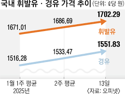 ํœ˜๋ฐœ์œ  ๊ฐ€๊ฒฉ์ด ๋‹ค์‹œ ๊ธ‰๋“ฑํ•˜๊ณ  ์žˆ์Šต๋‹ˆ๋‹ค. ์ตœ๊ทผ ๊ตญ์ œ์œ ๊ฐ€ ์ƒ์Šน๊ณผ ์›·๋‹ฌ๋Ÿฌ ํ™˜์œจ์˜ ๊ธ‰๋“ฑ์ด ํ•œ๊ตญ ๋‚ด ํœ˜๋ฐœ์œ  ๊ฐ€๊ฒฉ์— ์‹ฌ๊ฐํ•œ ์˜ํ–ฅ์„ ๋ฏธ์น˜๊ณ  ์žˆ์Šต๋‹ˆ๋‹ค. 2025๋…„ ์ดˆ, ํœ˜๋ฐœ์œ  ๊ฐ€๊ฒฉ์€ ์ „๊ตญ ํ‰๊ท  1,705์›์— ๋‹ฌํ•˜๊ณ  ์žˆ์œผ๋ฉฐ, ์„œ์šธ ์ง€์—ญ์—์„œ๋Š” 1,775์›์„ ๊ธฐ๋กํ•˜๋Š” ๋“ฑ ๊ฐ€๊ฒฉ ์ƒ์Šน์ด ๊ฐ€ํŒŒ๋ฅด๊ฒŒ ์ง„ํ–‰๋˜์—ˆ์Šต๋‹ˆ๋‹ค.