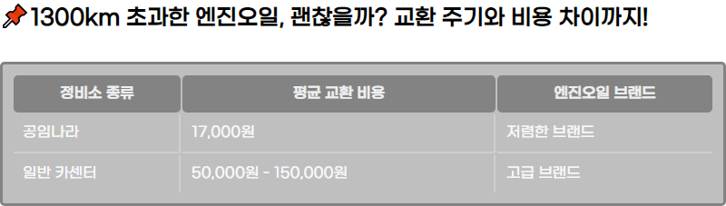 ์์ง์ค์ผ ๊ตํ ์ฃผ๊ธฐ๋ฅผ 1300km ์ด๊ณผํ์ฌ ์ดํํ ๊ฒฝ์ฐ, ์์ง์ ๋ฏธ์น๋ ์ํฅ๊ณผ ๋น์ฉ ์ฐจ์ด์ ๋ํด ์์๋ณด์ธ์. ์ ๋ฌธ๊ฐ๋ค์ด ๋งํ๋ ์์ง์ค์ผ ๊ตํ์ ์ค์์ฑ, ๊ณต์๋๋ผ์ ์ผ๋ฐ ์นด์ผํฐ์์์ ๊ฐ๊ฒฉ ์ฐจ์ด๋ฅผ ๋น๊ตํ๊ณ , ๊ณผ์ฐ ์์ง์ค์ผ์ ๋ฆ๊ฒ ๊ตํํด๋ ๊ด์ฐฎ์์ง ํ์ธํด ๋ณด์ธ์.