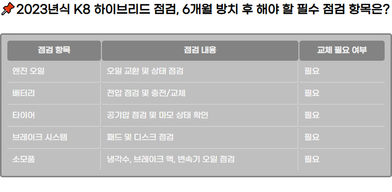 2023๋ ์ K8 ํ์ด๋ธ๋ฆฌ๋ ์ฐจ๋์ ์ค๋ ๊ธฐ๊ฐ ์ฌ์ฉํ์ง ์์์ ๊ฒฝ์ฐ, ๋ฐ๋์ ์ ๊ฒ์ด ํ์ํฉ๋๋ค. ์ด ์ฐจ๋์ ์ฐ์๊ณผ ์ํ์ ๋ฐ๋ผ ์ ๊ฒ ํญ๋ชฉ์ ์ ๋ฆฌํ๊ณ , ํ์ํ ์ ๊ฒ์ ์ฐ์ ์ ์ผ๋ก ํ์ธํ๋ ๊ฒ์ด ์ค์ํฉ๋๋ค. ์ด ๊ธ์์๋ 6๊ฐ์ ์ด์ ๋ฐฉ์น๋ ์ฐจ๋์ ์ ๊ฒํ๋ ๋ฐฉ๋ฒ์ ๋ํด ์์ธํ ์๋ด๋๋ฆฌ๊ฒ ์ต๋๋ค.