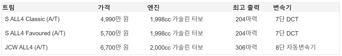 | JCW ALL4 (A/T) | 6,700๋ง ์ | 2,000cc ๊ฐ์๋ฆฐ ํฐ๋ณด | 306๋ง๋ ฅ | 8๋จ ์๋๋ณ์๊ธฐ |