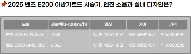 | ๋ฒค์ธ E200 ์๋ฐฉ๊ฐ๋ฅด๋ | 7.5์ด | 4๊ธฐํต M254 ์์ง | 9๋จ ์๋๋ณ์๊ธฐ | ์ฝ 6,000๋ง์ |