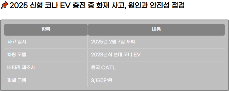 2025๋ ์ ์ฒ์์์ ๋ฐ์ํ ์ ํ ์ฝ๋ EV์ ์ถฉ์ ์ค ํ์ฌ ์ฌ๊ณ ์ ๋ํ ์์ธ ๋ณด๊ณ . ๋ฐฐํฐ๋ฆฌ ์ถฉ์ ํ 4์๊ฐ ๋ง์ ๋ฐ์ํ ํ์ฌ์ ์์ธ๊ณผ ์๋ฐฉ๋น๊ตญ์ ๋์, ํ๋์๋์ฐจ์ ๋ฐฐํฐ๋ฆฌ ์์ ์ฑ ์ ๊ฒ์ ๋ค๋ฃน๋๋ค. ์ฌ๊ณ ํ ํผํด ์ํฉ๊ณผ ๋ฆฌ์ฝ ์ด๋ ฅ๋ ํฌํจ๋์ด ์์ผ๋ฉฐ, ์ ๊ธฐ์ฐจ ์์ ์ฑ ๊ฐํ๋ฅผ ์ํ ์กฐ์น๊ฐ ๋ฌด์์ธ์ง ์์๋ด ๋๋ค.