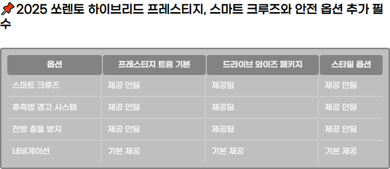 ๋๋ผ์ด๋ธ ์์ด์ฆ ํจํค์ง๋ ๋จ์ํ ์ค๋งํธ ํฌ๋ฃจ์ฆ ์ปจํธ๋กค์ ๋์ด์ ํ์ธก๋ฐฉ ๊ฒฝ๊ณ ์์คํ , ์ ๋ฐฉ ์ถฉ๋ ๋ฐฉ์ง ๋ณด์กฐ ์์คํ ๋ฑ ๋ค์ํ ์์ ๊ธฐ๋ฅ์ ํฌํจํ๊ณ ์์ด ์ฃผํ์ ์์ ์ฑ์ ํฌ๊ฒ ๋์ ๋๋ค. ์ด์ ๊ฐ์ ์ถ๊ฐ ๊ธฐ๋ฅ๋ค์ ๋จ์ํ ์ด์ ์์ ํธ์์ฑ์ ๋์ด ์ค์ํ ์ฌ๊ณ ์๋ฐฉ ์ฅ์น๋ก ์์ฉํ ์ ์์ต๋๋ค.