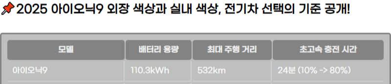| μμ΄μ€λ9 | 110.3kWh | 532km | 24λΆ (10% -> 80%) |