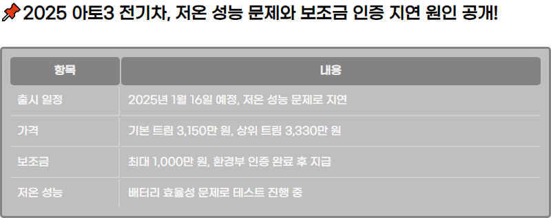 ์ ์จ ์ฑ๋ฅ ๋ฌธ์ ๊ฐ ๋ถ๊ฑฐ์ง๋ฉด์, ์ํ 3๋ ํ๊ฒฝ๋ถ์ ๋ณด์กฐ๊ธ ์ธ์ฆ ์ ์ฐจ์์ ์ถ๊ฐ ๊ฒ์ฆ์ ๋ฐ๊ฒ ๋์์ต๋๋ค. ํ๊ฒฝ๋ถ๋ ์ ๊ธฐ์ฐจ์ ์ฑ๋ฅ์ด ์ ์จ ํ๊ฒฝ์์๋ ์์ ํ๊ณ ํจ์จ์ ์ผ๋ก ์๋ํ ์ ์๋๋ก ์๊ตฌํ๋ ๊ธฐ์ค์ ์ค์ ํ๊ณ ์์ผ๋ฉฐ, ์ด์ ๋ฐ๋ผ ์ํ 3๋ ํด๋น ๊ธฐ์ค์ ์ถฉ์กฑ์ํค๊ธฐ ์ํด ์ถ๊ฐ ํ ์คํธ๋ฅผ ์งํํ๊ณ ์์ต๋๋ค. ์ด๋ก ์ธํด ๋ณด์กฐ๊ธ ์ ์ฒญ ๋ฐ ์ธ์ฆ์ด ์ง์ฐ๋๊ณ ์์ผ๋ฉฐ, ๊ตฌ๋งค์๋ค์ ์ด์ ๋ฐ๋ผ ์์๋ณด๋ค ๊ธด ์๊ฐ ๋์ ๋๊ธฐํด์ผ ํ ์ ์์ต๋๋ค.