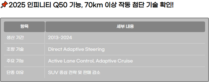 2025 ์ธํ”ผ๋‹ˆํ‹ฐ Q50 ๊ธฐ๋Šฅ, 70km ์ด์ƒ ์ž‘๋™ ์ฒจ๋‹จ ๊ธฐ์ˆ  ํ™•์ธ!