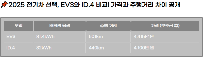2025๋ ์ ๊ธฐ์ฐจ๋ฅผ ๊ณ ๋ฏผํ๋ ์๋น์๋ค์ ์ํด EV3์ ID.4๋ฅผ ๋น๊ตํ ์ ๋ณด๋ฅผ ์ ๊ณตํฉ๋๋ค. ๋ ๋ชจ๋ธ์ ๊ฐ๊ฒฉ ์ฐจ์ด, ์ฃผํ๊ฑฐ๋ฆฌ, ๋ฐฐํฐ๋ฆฌ ์ฉ๋, ๊ทธ๋ฆฌ๊ณ ์ค์ ์ฐจ๊ธ ๋น๊ต๋ฅผ ํตํด ์ด๋ค ์ฐจ๋์ด ๋ ์ ํฉํ์ง ์์๋ณด์ธ์. EV3์ ID.4 ๊ฐ๊ฐ์ ์ฅ๋จ์ ๊ณผ ๊ฐ์ฑ๋น๋ฅผ ๊ณ ๋ คํ ์ต์ ์ ์ ํ์ ๋์๋๋ฆฝ๋๋ค.