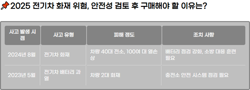 νΉν, 2024λ 8μμλ μΈμ² μ²λΌκ΅μ λμμ μννΈ μ§νμ£Όμ°¨μ₯μμ μ κΈ°μ°¨ νμ¬κ° λ°μνμ¬ μ£Όλ³ μ°¨λ 40λκ° μ μλμκ³ , 100μ¬ λμ μ°¨λμ μ΄ μμμ΄ λ°μνλ μ¬κ³ κ° μΌμ΄λ¬μ΅λλ€. μ΄ μ¬κ³ λ μ κΈ°μ°¨ νμ¬μ μνμ±μ μ 보μ¬μ€λλ€. λν, μ κΈ°μ°¨ λ°°ν°λ¦¬μ νμ¬λ κΈμ μΆ©μ , λ°°ν°λ¦¬ κ²°ν¨ λ± μ¬λ¬ μμΈμΌλ‘ λ°μν μ μμ΅λλ€.