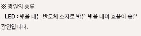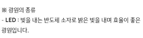 - LED : ๋น์ ๋ด๋ ๋ฐ๋์ฒด ์์๋ก ๋ฐ์ ๋น์ ๋ด๋ฉฐ ํจ์จ์ด ์ข์ ๊ด์์