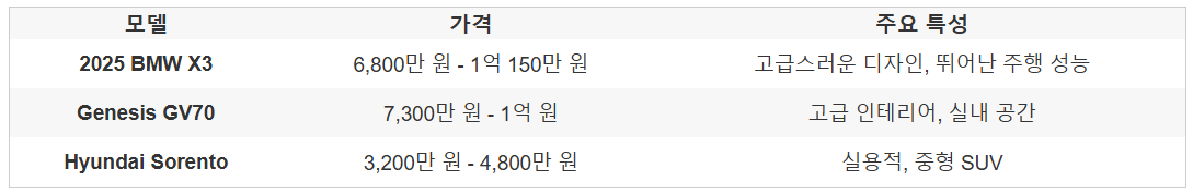 2025 BMW X3๋ ์ฌ๋ฌ ๊ฒฝ์ ๋ชจ๋ธ๊ณผ ๋น๊ตํ ๋ ๋ฐ์ด๋ ์ฑ๋ฅ๊ณผ ๋์์ธ์ ์๋ํฉ๋๋ค. ํนํ, X3๋ ์ ๋ค์์ค GV70 ๋ฐ ํ๋ ์๋ ํ ์ ๋น๊ตํ์ฌ ๋ ์ฐ์ํ ๊ฐ๊ฒฉ ๊ฒฝ์๋ ฅ์ ๋ณด์ ๋๋ค. ๋น๊ต๋ฅผ ์ํด ๊ฐ ๋ชจ๋ธ์ ์ฃผ์ ์ฌ์์ ์ดํด๋ณด๊ฒ ์ต๋๋ค: