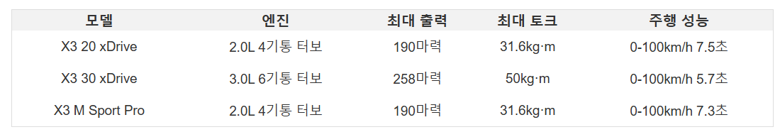 | X3 30 xDrive | 3.0L 6๊ธฐํต ํฐ๋ณด | 258๋ง๋ ฅ | 50kg·m | 0-100km/h 5.7์ด |