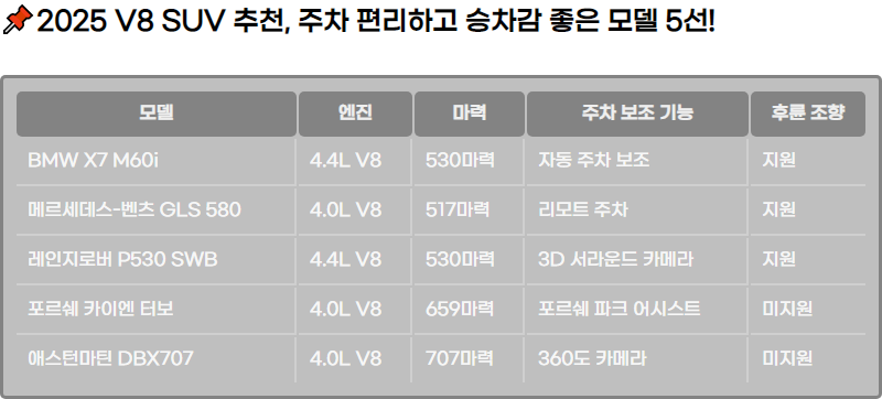 2025๋ ๊ฐ์ฅ ์ถ์ฒํ๋ V8 ์์ง SUV ๋ชจ๋ธ์ ์๊ฐํฉ๋๋ค. ํ๋ฅ ์กฐํฅ ์์คํ ๊ณผ ์๋ ์ฃผ์ฐจ ๋ณด์กฐ ๊ธฐ๋ฅ์ผ๋ก ์ฃผ์ฐจ๊ฐ ํธ๋ฆฌํ๋ฉฐ, ๋ฐ์ด๋ ์น์ฐจ๊ฐ์ ์ ๊ณตํ๋ ๋ค์ํ ์ต์ ์ ํ์ธํ์ธ์.