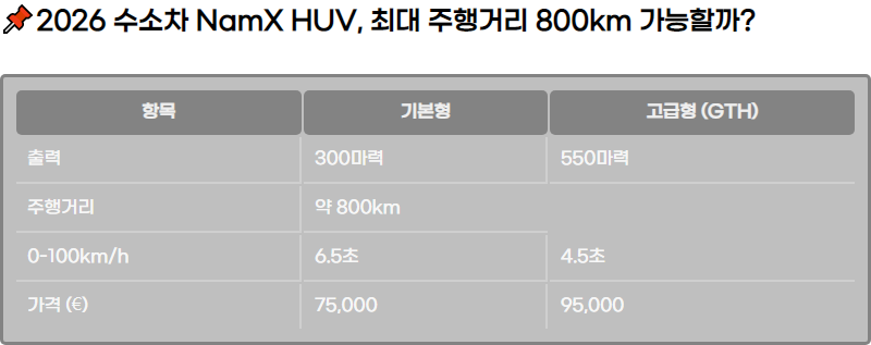 NamX HUV๋ ํ์ ์ ์บก์ํ ์์ ์ฐ๋ฃ ์์คํ ์ผ๋ก ์ต๋ 800km ์ฃผํ์ ๋ชฉํ๋ก ํ๋ ์์ SUV์ ๋๋ค. ์ฌ์ ์์ฝ, ์ฑ๋ฅ, ๊ฐ๊ฒฉ์ ๋ณด๋ฅผ ์ ๋ฆฌํ์ต๋๋ค.