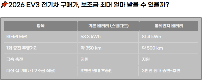 2026๋ EV3 ์ ๊ธฐ์ฐจ ๊ตฌ๋งค ์ ๋ณด์กฐ๊ธ๊ณผ ์ค๊ตฌ๋งค๊ฐ, ์ต์ ์ ์๊ณผ ์ฌ๊ณ ํ์ธ ํ์ ์์ ์ ๋ฆฌํ์ต๋๋ค. ๊ฐ๊ฒฉํ์ ์ฃผํ๊ฑฐ๋ฆฌ, ๋ณด์กฐ๊ธ ์ ๋ณด๊น์ง ์์ธํ๊ฒ ์๊ฐํ์ฌ ๊ตฌ๋งค ์ ๊ผญ ์์์ผ ํ ํต์ฌ ์ ๋ณด๋ค์ ์ ๊ณตํฉ๋๋ค.