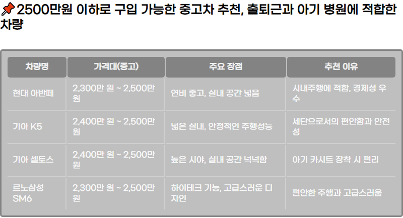 ์ด์ 2500๋ง์ ์ดํ๋ก ๊ตฌ์ ํ ์ ์๋ ๋ช ๊ฐ์ง ์ถ์ฒ ์ฐจ๋๋ค์ ์๊ฐํ๊ฒ ์ต๋๋ค. ์ด ์ฐจ๋๋ค์ ๋ชจ๋ ์๊ธฐ์ ํจ๊ปํ๋ ๊ฐ์กฑ์๊ฒ ์ ํฉํ ๋ชจ๋ธ์ ๋๋ค.